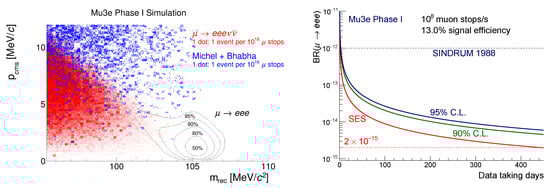 The feasibility of a background-free search for with the phase I Mu3e experiment up to the envisaged sensitivity has been demonstrated with a detailed Geant4-based detector simulation. The distribution of signal and background events in the centre-of-mass momentum () vs. invariant mass () plane of the system after kinematic, vertex and coincidence selections is shown in Figure 3 alongside the expected reach in in dependence of the runtime. Branching ratios of 10−14 to a few 10−15 can be reached with 200 to 300 days of data taking.