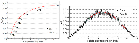 The physics non-linearity, which connects the visible energy and the number of emitted photons, is mainly driven by the quenching effect in the liquid scintillator and by the contribution of Cherenkov photons to the light yield. It can be constrained by combining the information from the multiple sources calibration results at the detector centre (left panel of Figure 3), and from the energy fit of the cosmogenic isotope B decay spectrum (right panel of Figure 3). Following this procedure, dedicated simulations show that the residual bias in the reconstructed energy can be kept at 0.2% level.