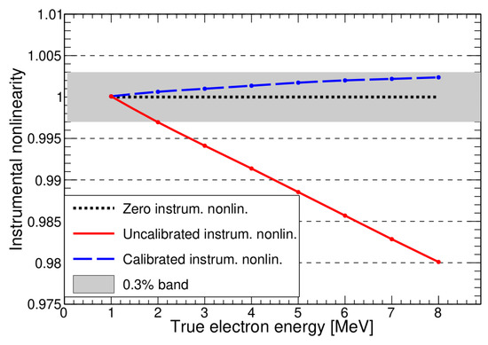 The instrumental non-linearity is defined as the ratio of the total measured LPMT charge to the true charge for events uniformly distributed in the detector. It can be calibrated by exploiting the dual calorimetry technique. This is based on the comparison of the response of LPMT and SPMT systems when an uniform illumination is induced by a tunable laser source [9], covering the 1–8 MeV energy range for IBD events. Following a such procedure, the instrumental non-linearity can be controlled at the 0.3% level (Figure 4).