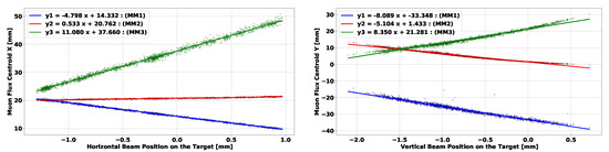 Muon flux centroid measurements as a function of proton beam position at the target. Blue, red and green distributions are the measured centroids on muon monitor 1, 2 and 3 respectively. The horizontal and the vertical scans are shown in the left and right plots, respectively.