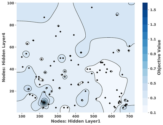 The correlation between the number of nodes in the 1st and the 4th hidden layers. Example of the hyperparameter optimization to obtain the number of nodes in the hidden layers. The hyperparameters are tuned based on obtaining the lowest objective values as shown in the contour plot.