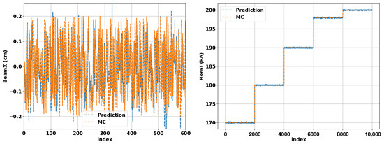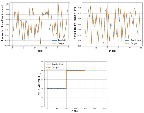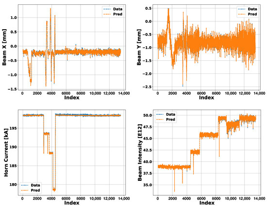 A comparison of the model predictions of four output variables on the validation data is shown in Figure 3. The top left and top right plots in Figure 3 show the predictions of the proton beam in horizontal and vertical positions. The beam intensity and the horn current predictions are shown in the bottom left and right plots in Figure 3.