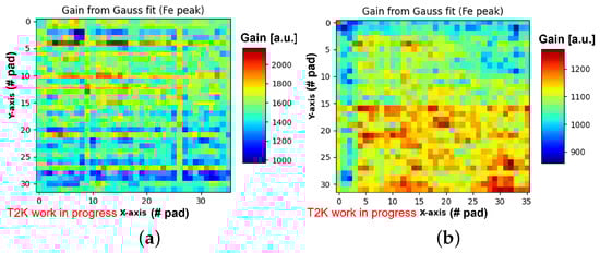 Map of gain for each pad of ERAM 11 (a) and ERAM 23 (b) obtained with X-ray test bench. Unexpected regular patterns are visible on ERAM 11.