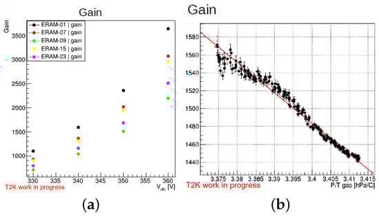 Voltage applied to DLC V reported in Figure 4a changes the gain accordingly for each ERAM, showing that a more intense electric field may enhance the gain. The working value is chosen as a trade off between gain and stability. In the case of Figure 4b, the ratio of pressure and temperature (p/T) is shown for the “T2K gas”. Under the approximation of constant volume of the setup, this may suggest that a higher number density of the gas decreases the gain of the detector according to a linear trend. Since a full X-ray scan for a single ERAM is performed in a span of few days, the effect of gas conditions on gain is being investigated further in order to take into account this effect when comparing the pads response.