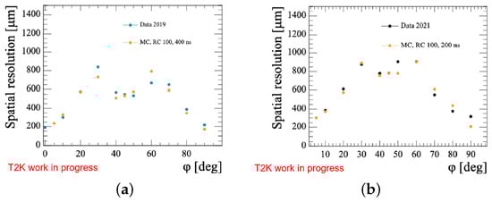Spatial resolution comparison between data collected at DESY 2019 (a) and 2021 (b) test beams and MC simulations.
