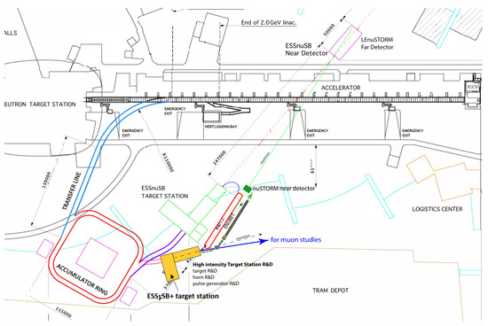 The recently published ESSSB CDR [6] has demonstrated that the initially foreseen physics performance of the detector has surpassed all earlier expectations. ESSSB will be measuring at the second oscillation maximum, where the sensitivity of CPV will be close to three times larger as compared to DUNE and T2HK experiments, which aim for measuring at the first oscillation maximum. However, the measurement of the neutrino–nucleus cross-sections (-A) is fundamental to reduce the systematic error in the determination of the from -oscillations, especially since data on -A cross-sections in the neutrino energy range of ESSSB, 0.2–0.6 GeV are currently very scarce [7]. An extension application of the ESSSB project, the ESSSB+, was submitted in March 2022 to the HORIZON-EU European Commission—and has recently been accepted (July 2022)—to be funded for the next four years. The ESSSB+ project aims to address this very challenging task on measuring the -A cross-sections using a Low-Energy nuSTORM [8] (LEnuSTORM) and an ENUBET-like [9] Low-Energy Monitored Neutrino Beam (LEMNB) facilities. However, several physics and technological challenges must be precisely studied and simulated before addressing the final design of this experiment. Among these challenges, the special target station plays the main role in producing a well-defined and focused pion beam, which will be then decayed to a muon beam in the straight section of the LEnuSTORM race track ring. Figure 1 shows the layout of the ESS site with the proposed ESSSB and ESSSB+ modifications.