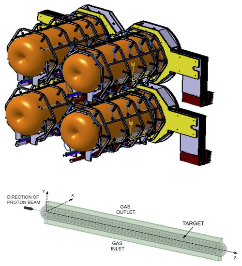 (Top) A 3D drawing of the four-horn target system. (Bottom) A 3D model of the target concept based on a packed bed of titanium spheres.