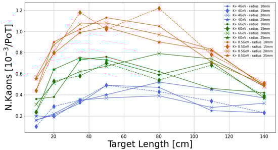 The production of a secondary hadron beam is achieved with a high-energy proton beam impinging on a solid target. We have assessed the effects of several target materials (in terms of production yields) and the fluence of various “primary” proton momenta on these yields. The optimization procedure allowed us to investigate a variety of materials, including graphite (density: 2.2 g/cm), beryllium (1.81 g/cm), Inconel (8.2 g/cm), and several high-Z materials including gold and tungsten. This study was performed using FLUKA [,] and G4Beamline [] simulation codes. Each target prototype was modeled geometrically as a cylinder with lengths ranging from 5 to 140 cm and radii between 10 and 30 mm. A phenomenological model extrapolated by pre-existing measurements predicted the production yields in a non-perturbative regime []; we then verified the model by testing each target with different primary momenta with FLUKA simulations. Compared to lower primary energies, the nominal energy of the CERN SPS (400 GeV/c) is confirmed to be the optimal choice for the maximum kaon yield production on the GeV/c scale, specifically a nominal momentum of 8.5 GeV/c. Next, graphite, beryllium, and Inconel-718 proved to be the optimal materials for both pion and kaon production. The particle yields for the graphite target are shown in Figure 1. This plot encompasses the production yield at all possible lengths and radii, from which an optimal length of around 70 cm is clear.