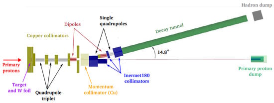 - Charitonidis, N.; Efthymiopoulos, I. Low energy tertiary beam line design for the CERN neutrino platform project. Phys. Rev. Accel. Beams 2017, 20, 111001. [Google Scholar] [CrossRef][Green Version]