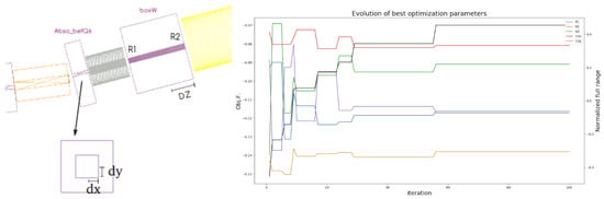 Schematics of the last two collimators placed upstream of the tagger (on the left) and convergence plot of the beamline iterations to maximize the FOM (on the right).