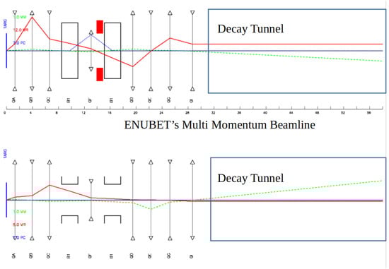 - Parozzi, E.; Brunetti, G.; Charitonidis, N.; Longhin, A.; Pari, M.; Pupilli, F.; Terranova, F. The ENUBET Multi Momentum Secondary Beamline Design. Jacow Ipac 2021, 2021, 3053–3056. [Google Scholar]