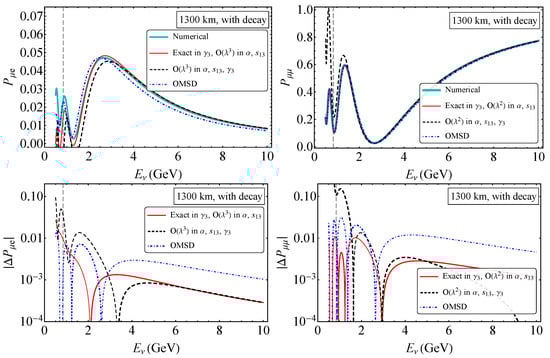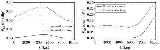 For decay with , Equation (11) predicts an increase of ∼0.02 at the first oscillation dip and ∼0.1 at the second oscillation dip for . In Figure 2, we test this prediction by plotting the numerical probabilities at these dips, in scenarios with and without decay. It is observed that the increase in the probability at these dips matches our estimates, even at large baselines where matter effects are important.
