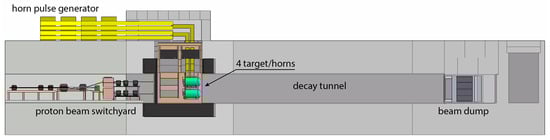 To produce the necessary pulsed magnetic field inside the magnetic horn focussing the mesons produced in the target located inside the horn, a pulsed current of 350 kA is necessary. A dedicated power supply needed to alternatively pulse the four horns with a frequency of 14 Hz, has been designed. To avoid irradiation of this device, it has been placed upstream of the target station, on top of the proton beam switchyard, as shown in Figure 3.