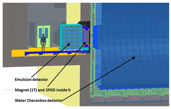 The neutrino near detector will be placed at a distance of 250 m from the target station (Figure 2) in the already ESS allocated area. It will be composed of a kiloton-scale Cherenkov detector (reduced size of the far detector) used for event-rate measurement and flux normalisation, neutrino interaction cross-section measurements in water and event reconstruction comparison with the far Cherenkov detector. In addition to the Cherenkov detector, a magnetised fine-grained tracker (SFGD) [8] will be used for precise tracking and energy determination. A nuclear emulsion detector for measuring precisely neutrino interaction topologies and cross-sections, similar to that of the NINJA experiment [9], will be installed upstream of the two above detectors. Figure 6 presents the whole near detector.