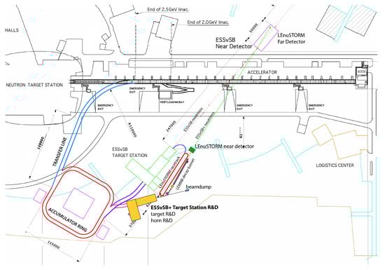Layout of ESSSB+ facility with the “low power” target station (yellow) followed by the low energy nuSTORM ring (red) and LEMNB (low energy ENUBET) decay tunnel.