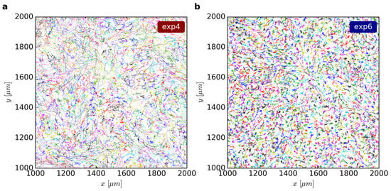 In a section (1 mm2) of the cell layer, all cell trajectories are shown for the experiments 4 (a) and 6 (b). The trajectories are labeled sequentially with one out of seven colors in the order of their first appearance and the attributed cell number. The overall cell density in (a) is much lower than in (b). This leads to different dynamics and pattern formation.
