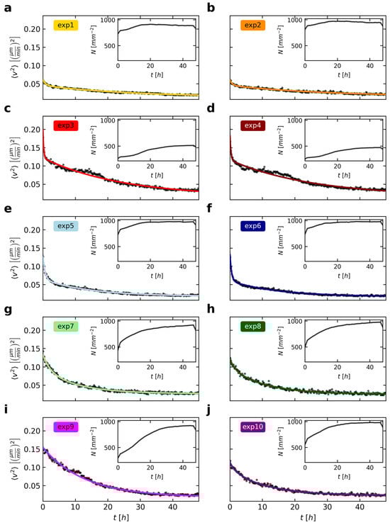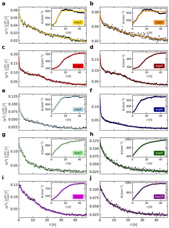 The fits to the mean squared velocity (a–j), as shown in Figure 2, were improved using Equation (3). The shown data of the cell density (inset) was fitted simultaneously for each experiment according to Equation (4). The quite small uncertainties (two standard deviations) of the model fit are represented as a gray area (almost only visible in the inset of (b)). Note that the ranges of the y-axes are optimally adjusted to each data set in contrast to Figure 2.