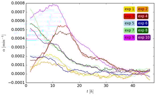 The changes in cell numbers α(t) (Equation (2)) are calculated for each time step. A uniform filter with a size of 300 min was applied to smoothen the data. Due to the defined minimum length of cell trajectories during image analysis, the first and last nine time steps were discarded.
