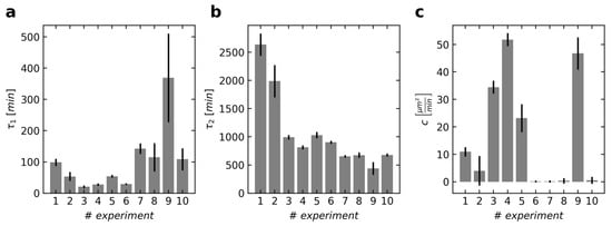 and N0 denotes the initial cell number at t = 0. The obtained parameters of the simultaneous fit, calculated individually for each experiment, indicate that the trend of the velocities consists of a faster and a slower decline (Figure 4). After about one to three hours (elapsed time equals two τ1), the cells have slowed down considerably (Figure 4a). After that time, the mean squared velocity decreases only slowly, with τ2 usually being greater than 10 h (Figure 4b). The exception from these findings is the ninth experiment, where the two declines are merged and therefore difficult to separate. The first two experiments show a particularly slow decline since the cell density had always been high and the cells from this umbilical cord showed less activity. At large, the obtained values for the parameters are roughly of the same magnitude compared to the counterparts of the isolated fit (Equation (1) and Figure 2). This indicates that there are at least two time-dependent phases, with the cell division causing the time-independent alterations of the overall dynamics. This third influence is especially strong in experiments 3, 4 and 9, as indicated by parameter c (Figure 4c), where the mean squared velocities were also the highest. The first experiment shows slightly more cell division than the second while the mean squared velocities are almost the same (Figure 2a,b). Interestingly, the optimal parameters for the combined fit include a higher c and subsequently higher τ1 and τ2 (Figure 4) instead of these three parameters just being smaller. This might emphasize the importance of considering cell division in the model.