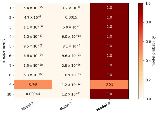 The comparison of the evidences of the applied models shows a clear preference for Model 3 for nine out of ten experiments (Figure 6). This endorses the theory that there is usually a decline consisting of two parts with different temporal dynamics. Only the ninth experiment could also be described with just one exponential function. These cells showed the strongest and longest-lasting cell division phase out of all experiments, which led to a more than two-fold increase in cell density. This influence was incorporated into the fit for the velocity via a high coupling parameter c (Figure 4c). Thus, the effect of the proliferation-independent cell movements is less recognizable, especially because the processes occur largely simultaneously. This might have also caused the small difference between τ1 and τ2 and its higher error (Figure 4a,b).