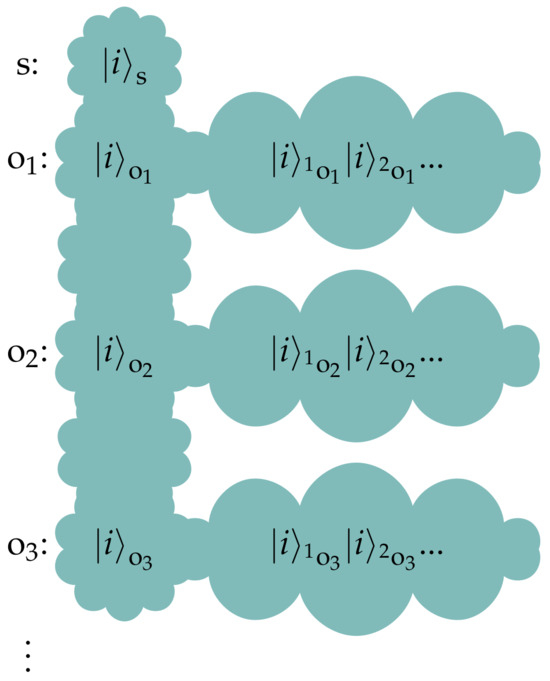 Furthermore, if each of these observers o are themselves classical objects that decohere, what obtains is a highly branched network of states that all agree with one another (Figure 4). This lends stability to the decohered network of states, as in order to delete the information about the state of the signal, all the systems it has interacted with have to come together to conspire to undo this correlation. In the following Section 4.2, we consider what happens when measurements are performed in different bases. It turns out that an objective classical reality does not then emerge, as the different observers do not agree with one another on what the state of a signal is. The network of redundant information in Figure 4 is exactly what protects against such a loss of objectivity.