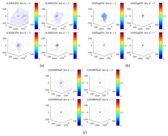 To see how fast the LMMRFMaP algorithm is when compared to the eLMMLEM and LMMaPEM algorithms, we fix the number of events at events/view and observe the evolution of the associated reconstructed 3D images at the k-th iteration with . Visually, we can find from Figure 2 that the point cloud returned by the LMMRFMaP algorithm converges to true punctual source (marked by the red cross) much faster than the one returned by the two other algorithms.