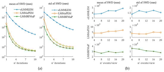 where is given either from (9), (10) or (11); and are, respectively, the coordinate vectors of the voxel and the punctual source; and standards for the Euclidean norm. The SWD exhibits a compromise between the intensity of the voxels and their accuracy with respect to the source location. The lower the value of , the nearer the reconstructed 3D image is to the true source. Fixing the number of events at events/view, we randomly build 100 list-mode data-spaces, reconstruct the images of punctual source following (9), (10) and (11), and compute the associated SWD following (12). Next, we sketch the evolution of the mean and the standard deviation of these SWD with respect to the iteration number k in Figure 3a. Clearly, the proposed LMMRFMaP algorithm exhibits a higher convergence speed and higher reconstruction quality than the LMMaPEM and eLMMLEM algorithms. Similarly, we fix the iteration number at , and vary the number of events/view from 4 to 20 with step 4 to evaluate the impact of the events number on the reconstruction performance. Indeed, for each of these configurations, we also build 100 list-mode data-spaces, compute the associated SWD for the considered algorithms, then sketch in Figure 3b the evolution of their mean and standard deviation.