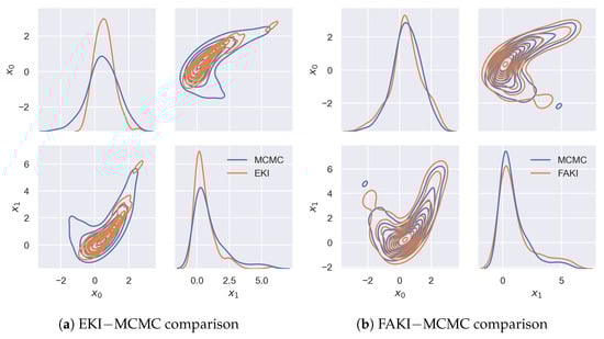 In Table 1, we provide statistics summarizing the performance of EKI and FAKI on our numerical benchmarks. We measured the quality of the posterior approximations by computing the 1-Wasserstein distance, [,], between the samples obtained through FAKI and EKI against reference posterior samples obtained via long runs of the Hamiltonian Monte Carlo (HMC) algorithm [,]. These reference samples were thinned to be approximately independent when computing the 1-Wasserstein distances (we use the Python Wasserstein library: https://github.com/pkomiske/Wasserstein/ (accessed on 30 June 2023)). The 1-Wasserstein distance may be interpreted as the cost involved in rearranging one probability measure to look like another, with lower values indicating the two probability measures are closer to one another. In addition to this assessment of the approximation quality, we report the number of iterations, , required by FAKI and EKI for convergence. For both quantities, we report the median and median absolute deviation (MAD) estimated over 10 independent runs using different random seeds.