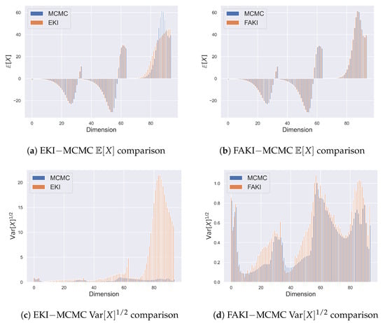 In Figure 2, we show the ensemble estimates for the mean and standard deviation along each dimension obtained by EKI and FAKI, compared to reference estimates obtained through long runs of HMC. FAKI was able to obtain accurate mean estimates along each dimension, whereas EKI was unable to obtain the correct means for much of the trajectory. EKI severely overestimated the marginal standard deviations along many dimensions. This situation was alleviated by the NF mappings learned by FAKI. The greater fidelity of the FAKI posterior approximations is reflected in the median estimates for the 1-Wasserstein distances, with a value of for FAKI and for EKI.