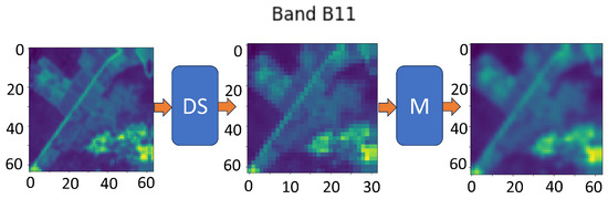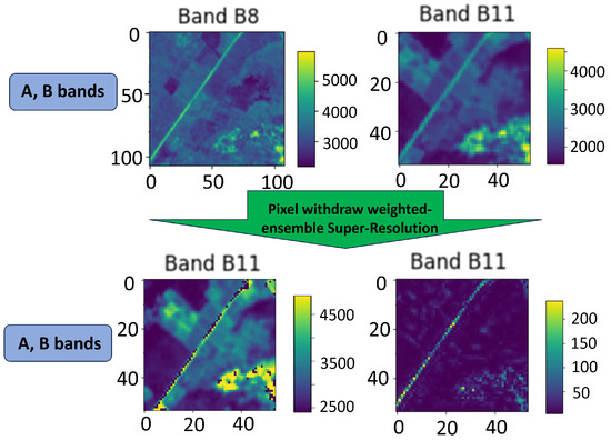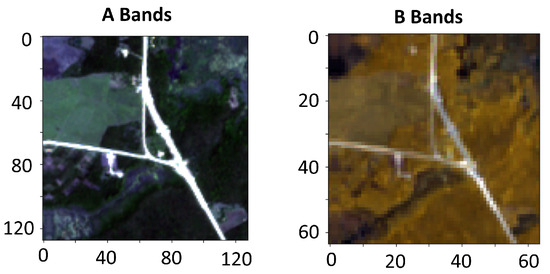 where the B bands, as depicted in Figure 1, are upsampled to the same resolution as the A bands with bi-linear interpolation. The associated linear operator, is applied to each B band.