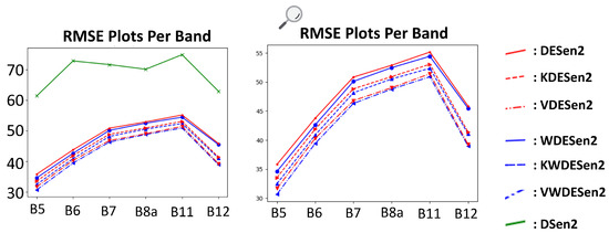Band-wise RMSE of different deep ensemble methods (DESen2, KDESen2, VDESen2, WDESen2, KWDESen2, and VWDESen2). Each ensemble was composed of 30 members, and the baseline of DSen2 corresponds to 1 ensemble member. The RMSE was computed over 300 patches of tropical data.