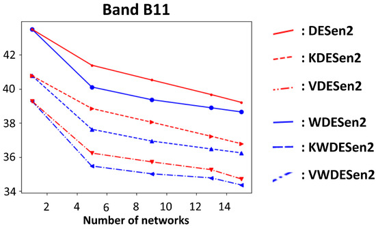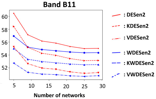 Figure 7, Figure 8 and Figure 9 enable one to compare the predictions of WDESen2, KWDESen2, and VWDESen2 with those of deep ensembles, where the predictions are given by (2) and the variance by (3). Selective prediction, as in Section 2.3, was applied to deep ensembles DESen2, resulting in a variance-based DESen2 method (VDESen2) and a kernel-based DESen2 method (KDESen2). Table 2 shows that removing the most uncertain of the total number of pixels could significantly reduce the band-wise RMSE by up to for VDESen2, and removing the pixels with a high value in the kernel projection could reduce the band-wise RMSE by for KDESen2. Moreover, Figure 7, Figure 8 and Figure 9 show that weighted deep ensembles with and without selective prediction were more accurate in terms of band-wise RMSE than deep ensembles and the baseline model from [4]. Moreover, Figure 8 and Figure 9 indicate that, depending on the dataset, 10–15 ensemble members obtained better accuracy compared to smaller ensembles.