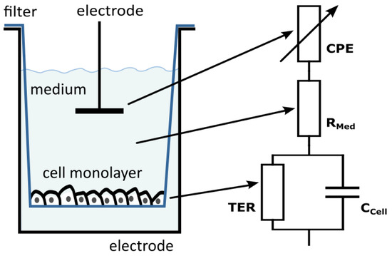 Scheme of the measurement setup: Isolated cells are cultivated on a filter and inserted in a so-called well, which is embedded in tissue medium. and are measured via a two-electrode setup. The transendothelial resistance, , as a quantity of endothelial barrier function, is determined by an equivalent circuit model. One typically used model consists of a constant phase element (CPE), describing the non-ideal capacity behavior of the electrode–electrolyte interface, an ohmic resistance for the medium, and an RC-circuit (in this case with R = TER and C = ) for the cell monolayer cultivated on the filter support.