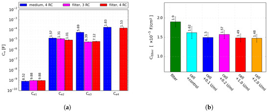Analyzing the wells with medium and raw filter showed that also the model containing a CPE and RC-circuits without further elements proved to be the most appropriate model. For up to 20% of all time points with = 4, no valid parameter estimation was possible; therefore, it was decided to except as the optimal number of RC-circuits for the whole time course. To compare the values of the capacities for the different measurement conditions, estimated capacities were sorted according to magnitude and the mean value of all time points was calculated. There was high equality for two of the capacities of medium only and medium with raw filter. Especially, the formerly mentioned with the range of 10−9 F was in good accordance between the two measuring conditions. However, for there was a discrepancy of one magnitude. That difference is not due to the missing RC-circuit. For some time points, even could be estimated, and there remained stable and was again in good accordance to medium measurements (see Figure 2a). Therefore, this RC-circuit describes filter specific behavior.