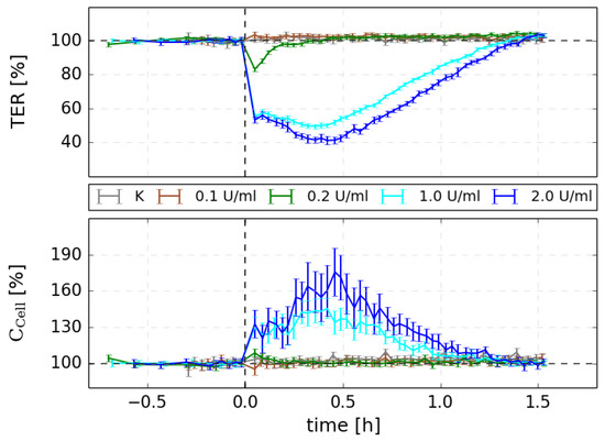 The resulting TER showed the well-known concentration-dependent decrease after thrombin stimulation. The parameter estimation was robust and with small uncertainties (see Figure 3).