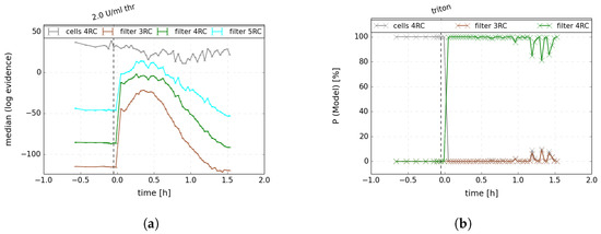 To further analyze and quantify the damage of the monolayer caused by high concentrations of thrombin or triton X-100, a model comparison was executed for a model of a CPE with RC-circuits with or without the cell-specific RC-circuit, which can be strictly separated by the prior as explained above. After adding thrombin 2.0 U/mL, there is a high increase in the evidence of the cell-free models (with = 3 to 5), but the cell model still remains with the highest evidence (see Figure 4a). When adding triton X-100, the evidence of a filter with = 4 is much higher, resulting in a shift of model probabilities, indicating that there is no intact monolayer remaining, which has to be incorporated in the model (see Figure 4b).