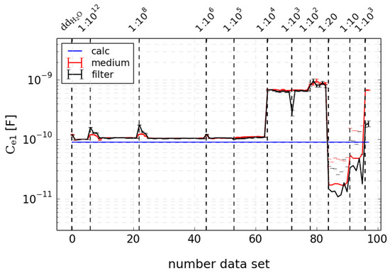 The measurements with sodium chloride and deionised water () were also analyzed with the model of a CPE and RC-circuits. The analysis revealed the low capacitance mentioned above, which also resulted in an equivalent range without dependency on sodium chloride concentration (see Figure 5). There is only a fluctuation of less than 1 magnitude for higher concentrations. The other capacities showed an interesting course with low values for low concentrations and an abrupt rise after a kind of edge concentration to magnitudes comparable to those estimated with cell medium (data not shown). Ref. [15] compared a circuit model of a series connection of a capacitance and an RC-circuit for a two-electrode setup with a dynamic density functional theory equivalent to the Nernst–Planck–Poisson theory of two sorts of ions in a fluid. The estimated parameters were compared to the equations of this simple model. There was good accordance of the magnitude of this low, concentration-independent capacitance, as illustrated with the blue line in Figure 5. This indicated that this is mainly determined by the setup properties like the distance and size of the electrodes. The slight divergence for higher concentrations may be due to additional correlation effects that were included in the theoretical model of [15].