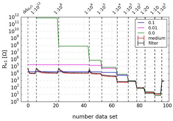 By contrast, the corresponding resistance is clearly concentration-dependent and also showed high similarity to the calculated values, especially for higher concentrations (Figure 6). This means that this resistance is determined mainly by the medium. Differences in low concentrations are probably due to the discrepancy of the theoretical assumed concentration of sodium chloride and real values since there was no control with additional measurements (like conductivity of the medium). Accordance was optimized through consideration of a factor for real sodium chloride concentration, as indicated in blue and red; the green line shows the calculated values without this factor.