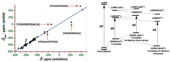 A qualitative molecular orbital diagram demonstrating the impact of different ligands in free and vanadium(V) coordinated catechol and their effects on 51V NMR chemical shifts. Note in this figure [VO(HSHED)dtb] was abbreviated [VO(HSHED)dtbCat]. Adopted with permission from Ref. [9]. 2011. American Chemical Society.