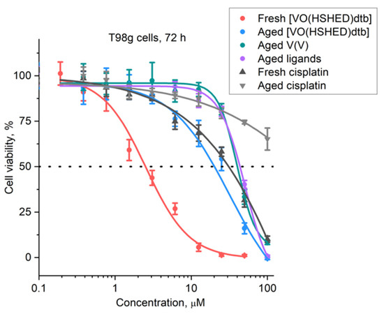 Dose-response curves of fresh [VO(HSHED)dtb], aged [VO(HSHED)dtb], fresh cisplatin, and aged cisplatin in T98g cells (72 h treatments). “Fresh” solutions were added to the cell culture medium less than 60 s prior to cell treatment. “Aged” solutions were incubated in a cell culture medium under a 5% CO2 atmosphere for 24 h at 310 K before addition to cells. Adopted with permission from Ref. [6]. 2020. Wiley-VCH GmbH.