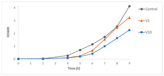 Time evolution of Enterococcus faecalis growth in the absence and in the presence of V1 or V10 compounds at 0.5 mM concentration.