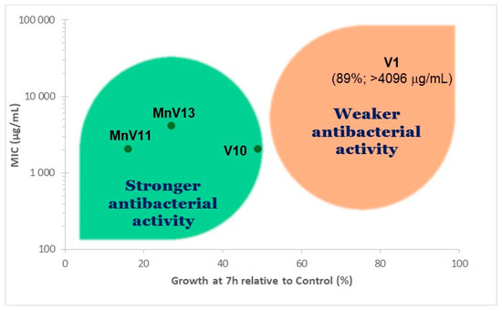 In addition, the MICs of the POVs against E. faecalis were determined from 18 h cultures in the presence of a series of concentrations up to 4096 μg∙mL−1. The MIC values obtained were 2048 μg∙mL−1 for V10 and MnV11, 4096 μg∙mL−1 for MnV13, and >4096 μg∙mL−1 for V1. These results are in line with the efficacy of the same compounds against E. coli measured previously [2], suggesting that POVs yield broad antibacterial action.