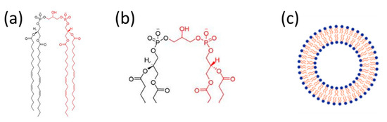 Representation of (a) the molecular structure of cardiolipin and (b) detail of the polar part, and (c) a unilamellar vesicle.