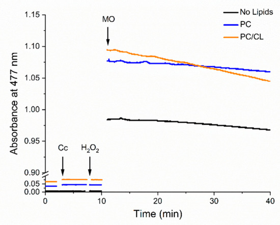 Representative assays of methyl orange decolorization catalyzed by cytochrome c in the absence of lipids and in the presence of phospholipid vesicles. Small unilamellar vesicles of phosphatidylcholine (PC) and of a mixture with cardiolipin (PC/CL) were tested. The concentration of cytochrome c (Cc) was 0.01 mg/mL, hydrogen peroxide 100 μM, and methyl orange (MO) 10 mg/L. Other experimental conditions are described in Methods.