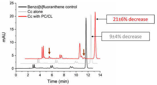 Nevertheless, by including CL vesicles in the assay media, the transformation became evident from the decrease observed in the benzo[b]fluoranthene and benzo[a]pyrene chromatographic peaks and by the emergence of reaction product peaks in the chromatograms. Results from benzo[b]fluoranthene assays are shown in Figure 3.