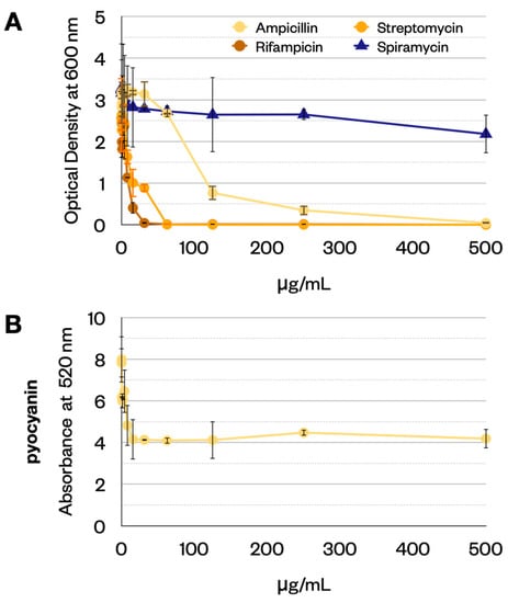 (A) Measure of biomass (OD at 600 nm) in the MIC experiment. (B) Measure of pyocyanin (absorbance at 520 nm). Error bars show the standard deviation (three replicates).