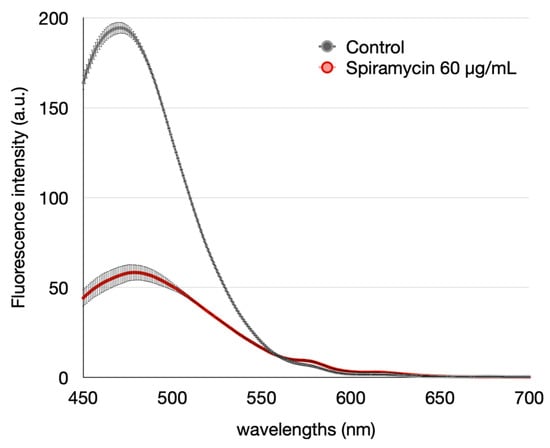 Some studies have reported that macrolides inhibited the ability of P. aeruginosa to form biofilms. We performed biofilm growth experiments to confirm that spiramycin had the same effect. The administration of spiramycin (60 μg/mL) causes a marked reduction in the synthesis of pyocyanin (Table 1) and pyoverdine (Figure 2). Furthermore, the administration of spiramycin (60 μg/mL) inhibits biofilm formation (Table 1) and increases the number of planktonic cells (Table 1).
