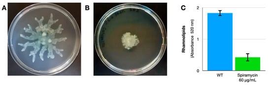 Effect of spiramycin on motility and rhamnolipids production of P. aeruginosa. (A,B) P. aeruginosa on the medium described by Gödeke et al., 2013 [19] without (A) or with (B) spiramycin (60 μg/mL). Error bars show the standard deviation (three replicates). (C) Spiramycin (60 μg/mL) also reduces the production of rhamnolipids in liquid broth.