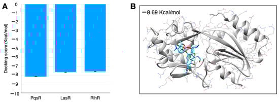 We performed docking simulation using SwissDock (http://www.swissdock.ch/, accessed on 8 September 2022). The simulations were performed using spiramycin A as the ligand. We used three protein structures as receptors. These proteins were regulators involved in Quorum Sensing: LasR (4ng2), PqsR (4jvd), and RhlR (AF-P54292-F1).