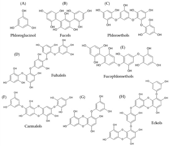 Chemical structure of representative phlorotannin groups. (A) Phloroglucinol monomer; (B) Trifucol; (C) Tetraphlorethol B; (D) Pentafuhalol B; (E), Fucodiphlorethol; (F) Diphlorethohydroxycarmalol; (G) Eckol; (H) Dieckol.